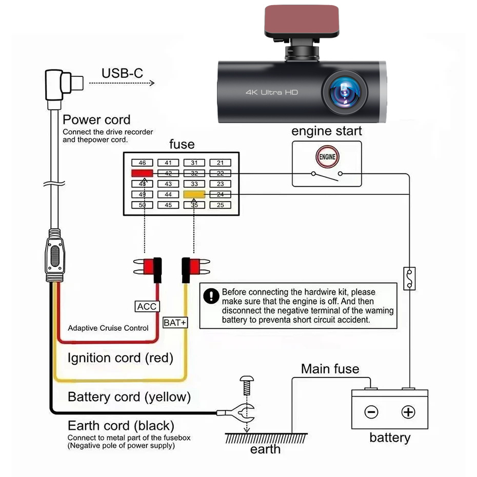 4K Resolution: Front camera records in 4K@25fps, rear camera in 1080P@25fps for high-definition dual recording.